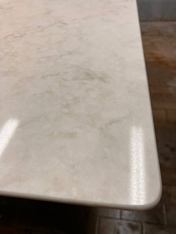 Volwaardig keukenblad, schuin afgewerkt langs de zijdes, ronde hoeken.