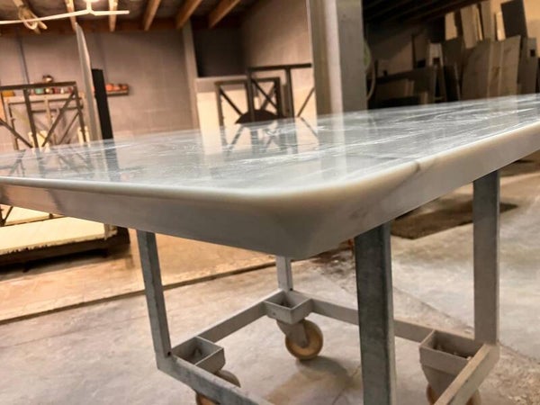 Volwaardig keukenblad, schuin afgewerkt langs de zijdes, ronde hoeken.